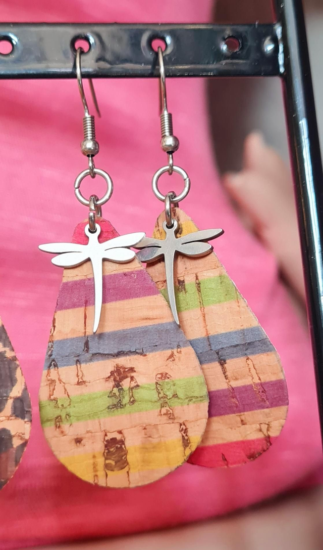 Boucles d'oreilles "goutte" tissu "lignes" coloré + libellule et