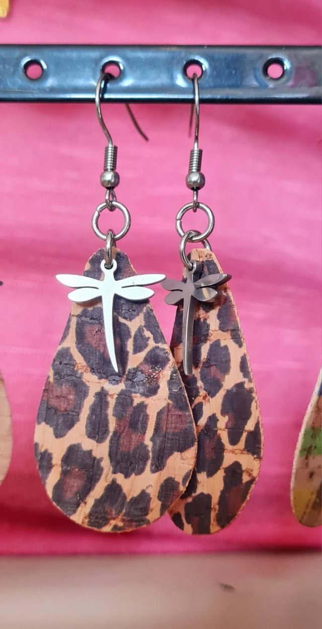 Boucles d'oreilles "goutte" tissu léopard + libellule et crochet