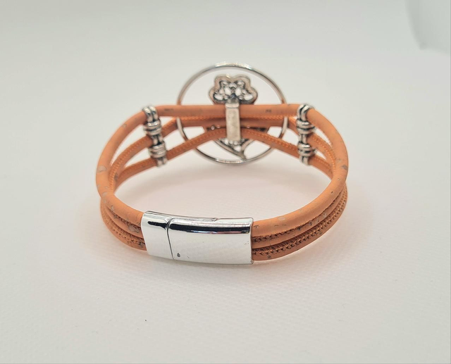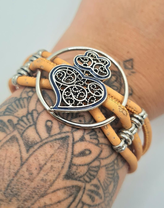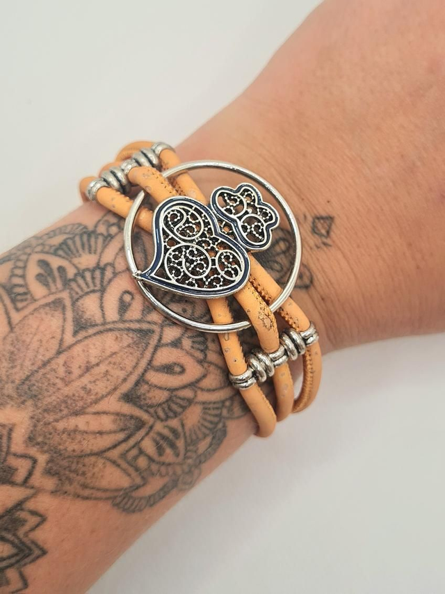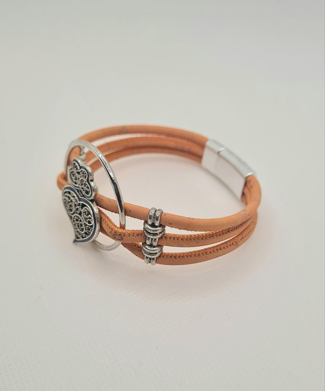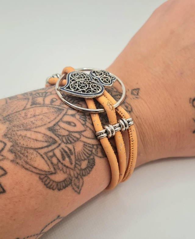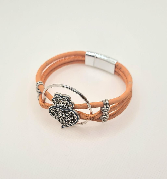 Bracelet 3 rangs en liège teinté orange pâle, anneau et cœur de Viana
