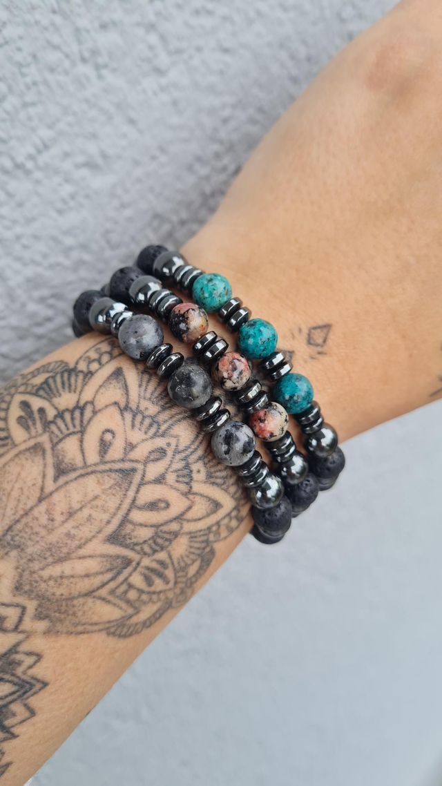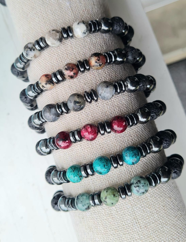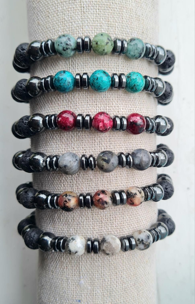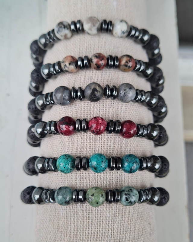 Bracelet élastique pierres hématite et lave + pierres jaspe/labradorite