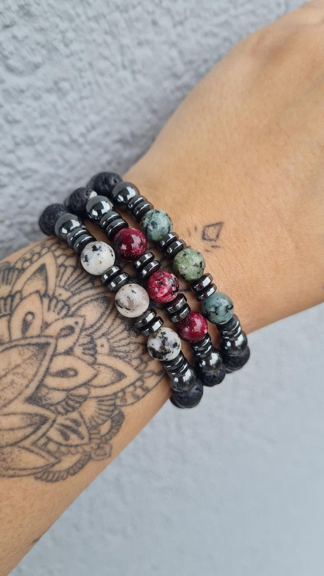 Bracelet lave et hématite + jaspe dalmatien naturelle