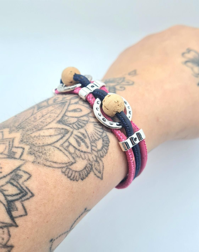 Bracelet "Munich" 3 rangs liège fin fushia et marine + perles