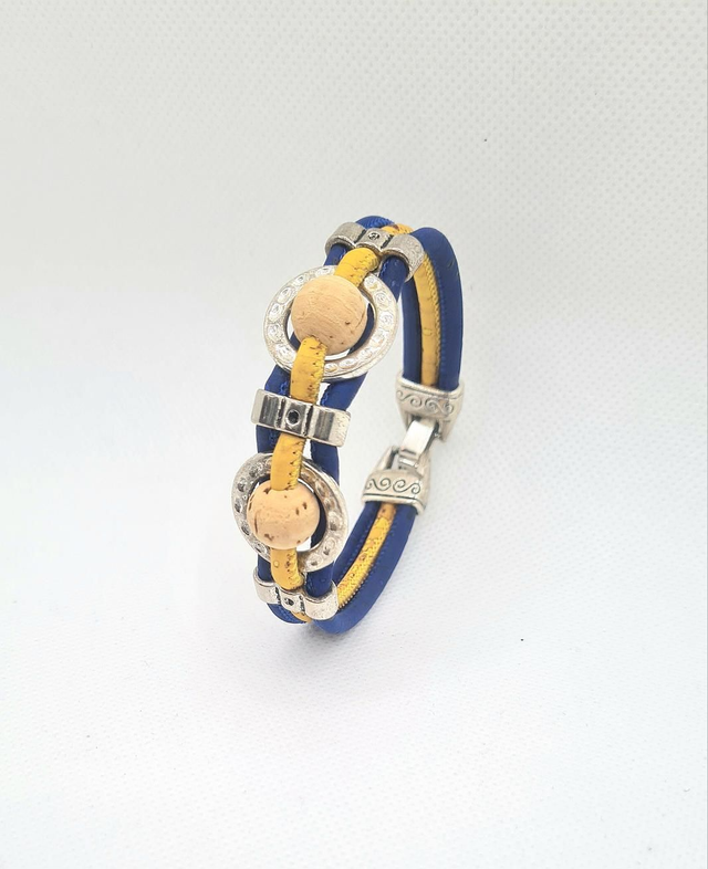 Bracelet "Munich" 3 rangs liège fin bleu roi et moutarde+ perles