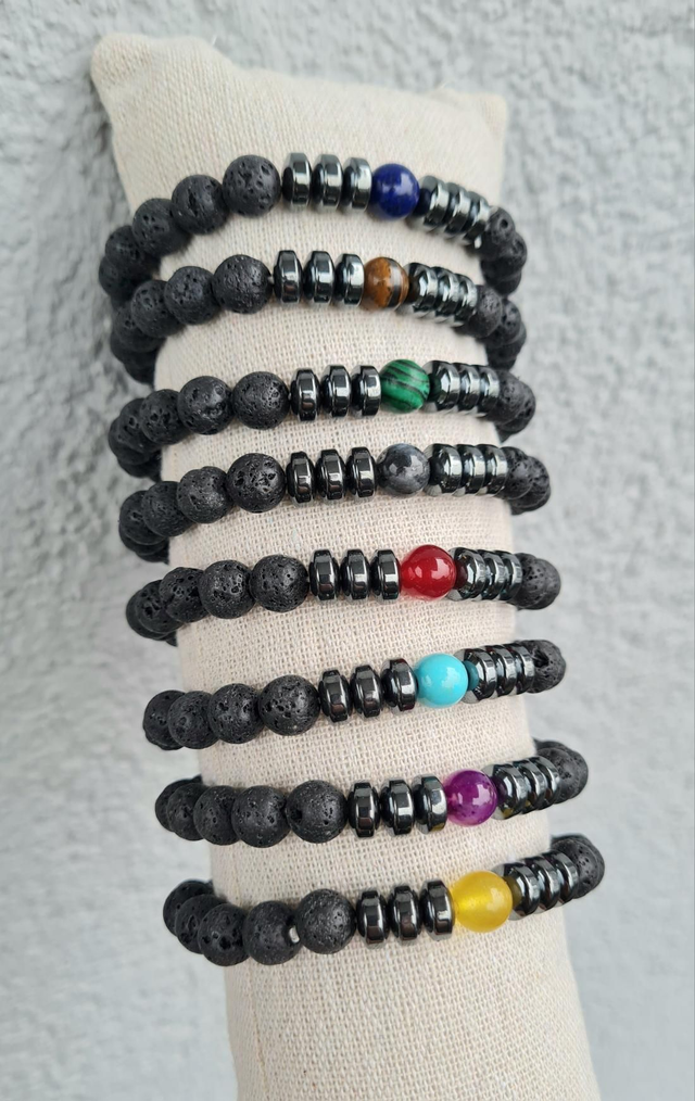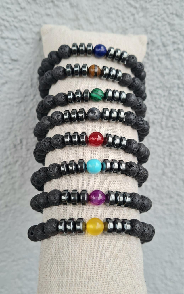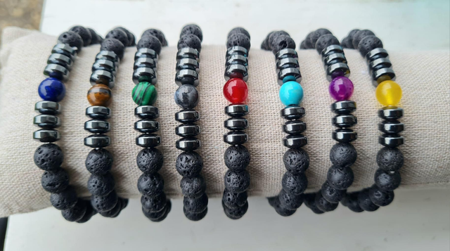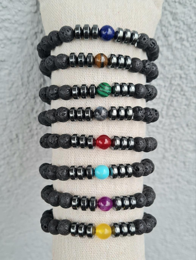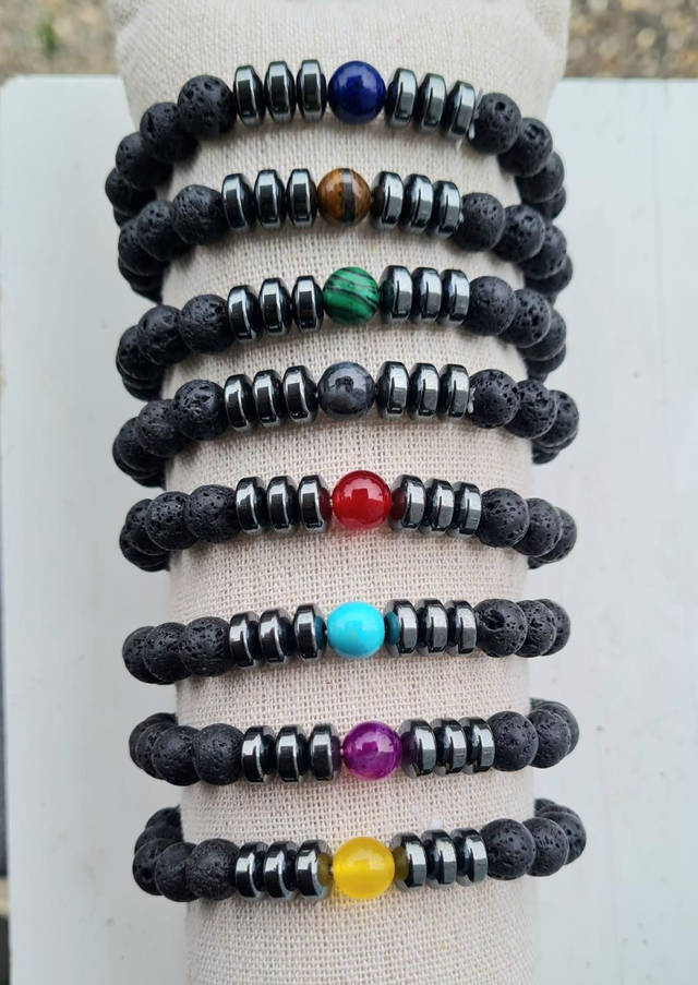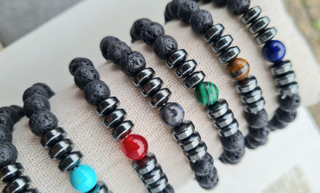 Bracelets en perles semi-précieuses lave et rondelles en hématite avec perle centrale colorée