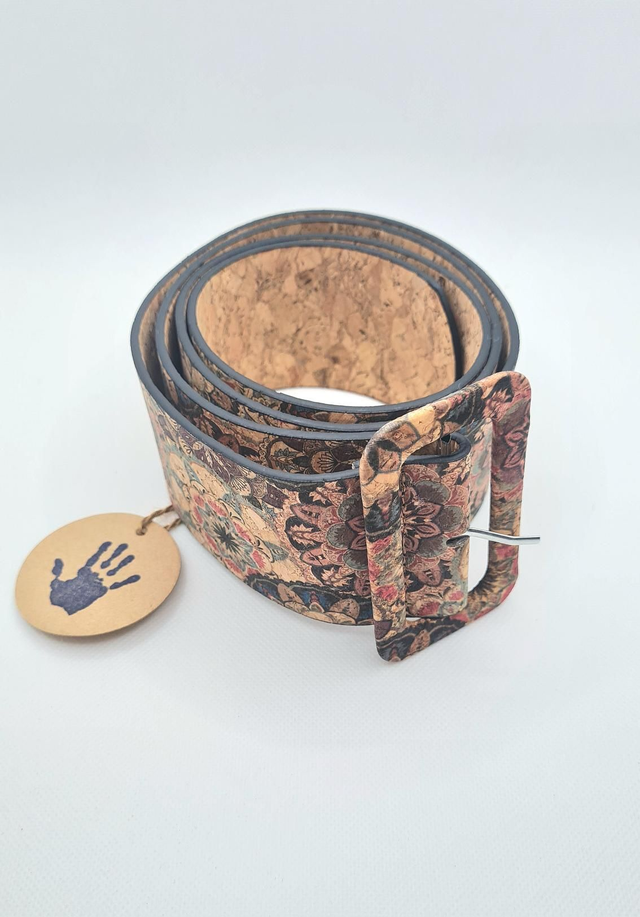 Ceinture de 111mm et de 60mm de largeur. Liège imprimée floral aux tons automnaux sur le devant et liège naturel à l'intérieur. Réglable grâce aux nombreuse perforations. À porter ajoutée ou loose.