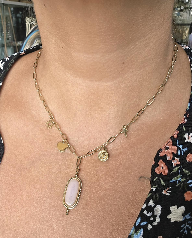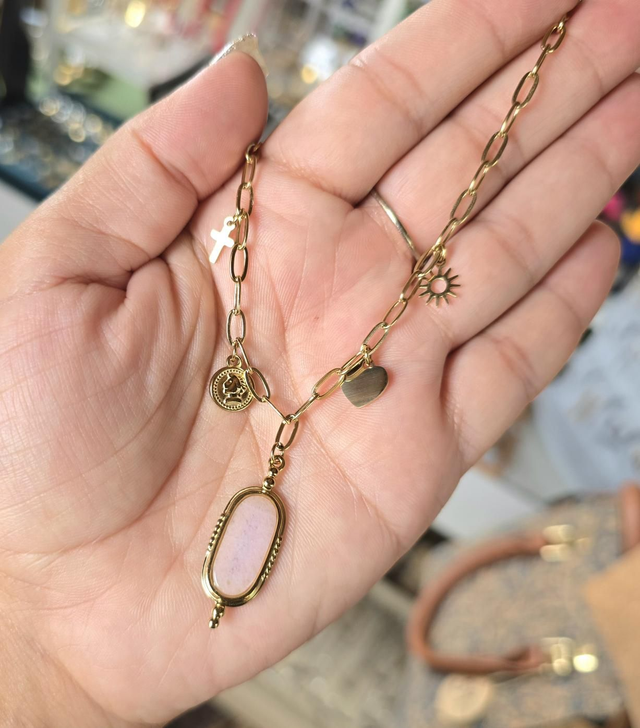Collier "Marquise" en acier inoxydable doré et quartz rose plat