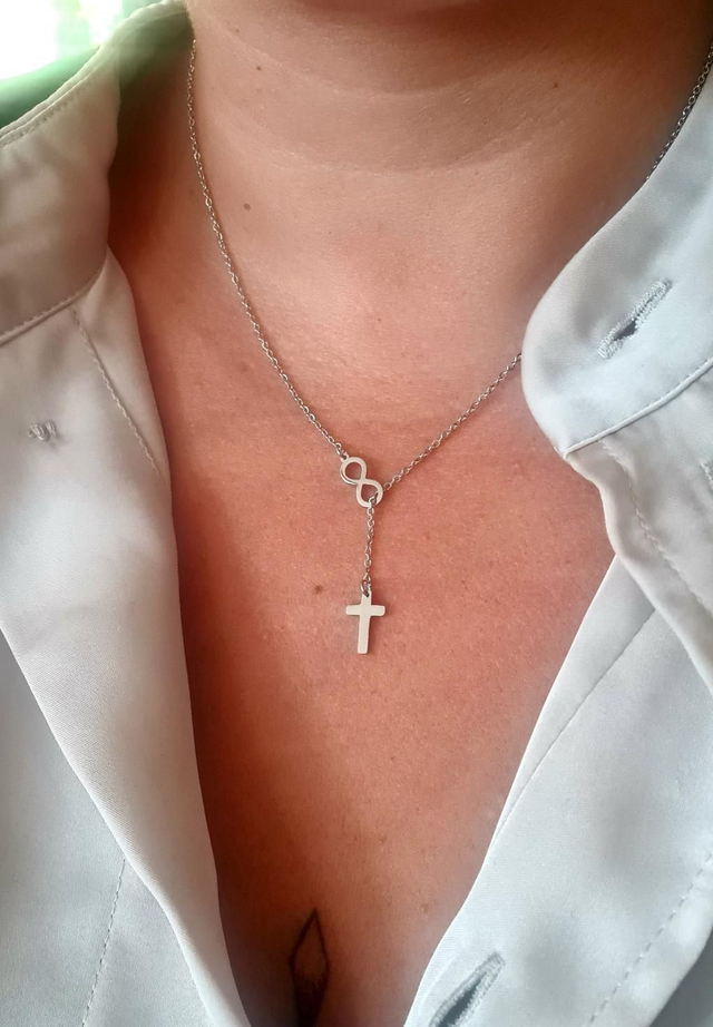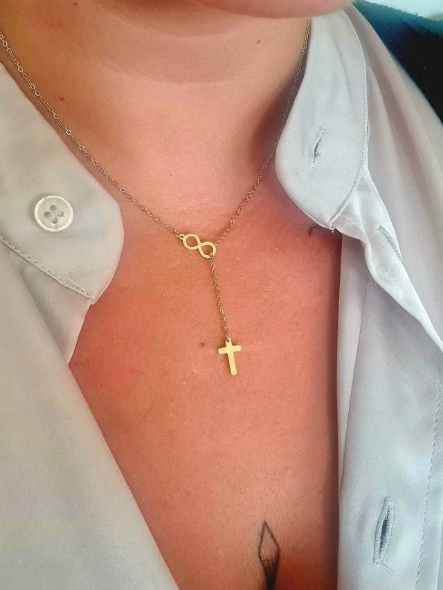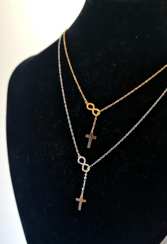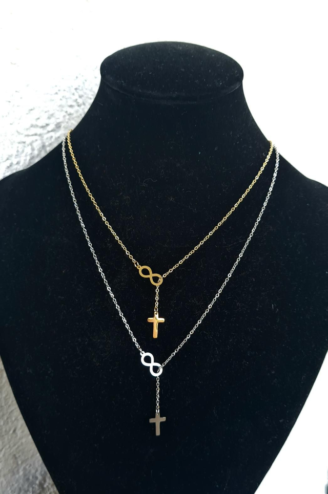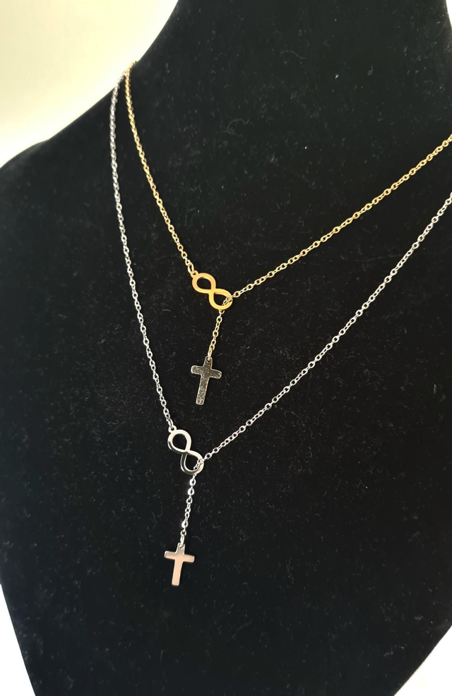 Collier "Melly" en acier argenté ou doré avec symbole de l'infini et croix à l'extrémité des chaînes