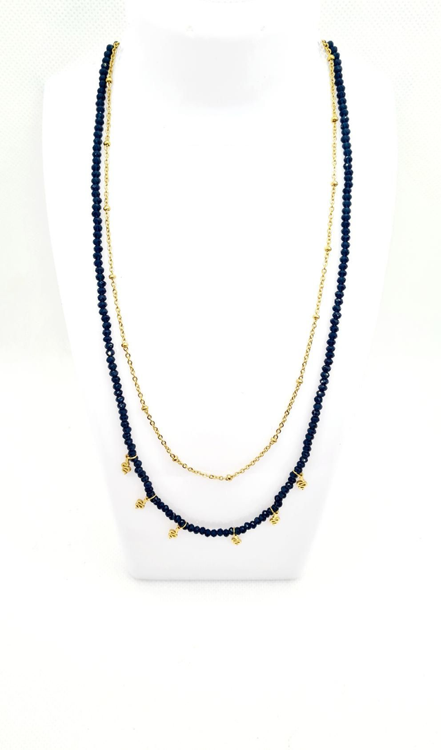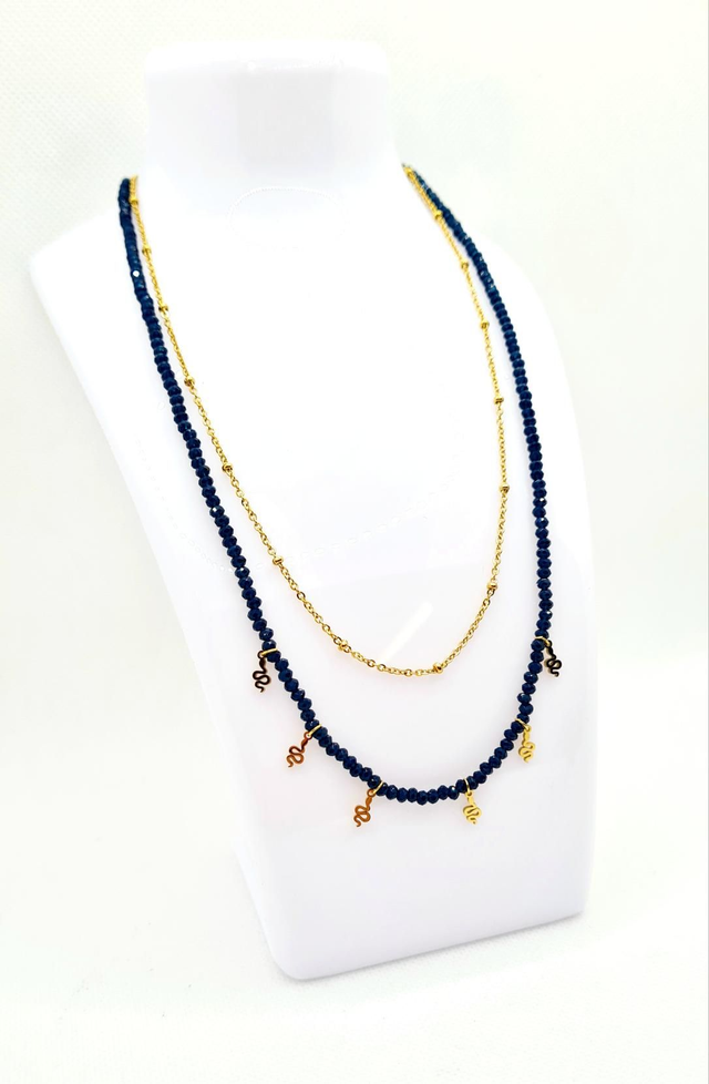 Collier "Snake" 2 rangs en acier or et perles de bohème bleu nuit