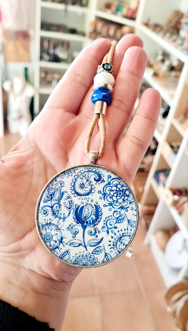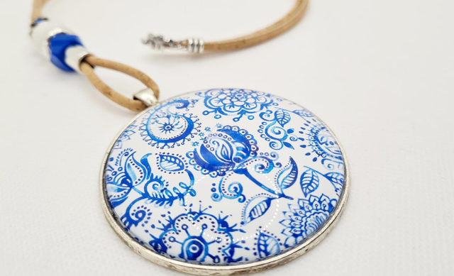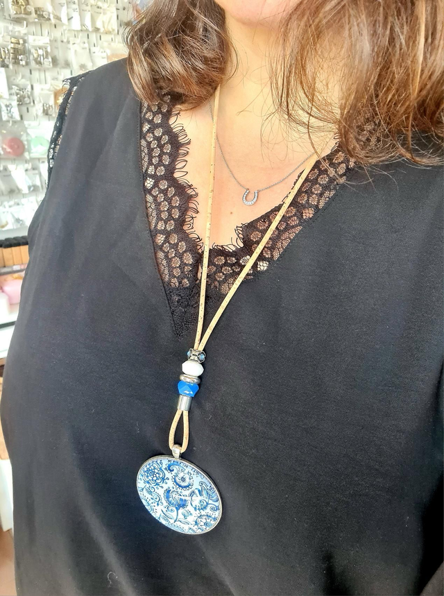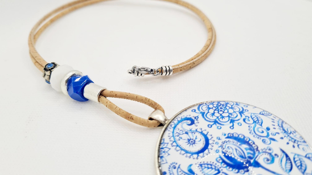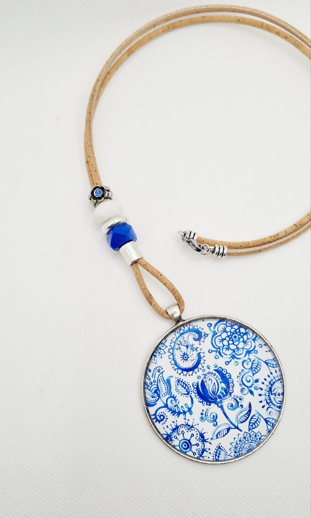 Long sautoir en cordon de liège naturel fin, perles et gros cabochon "bandana bleu"