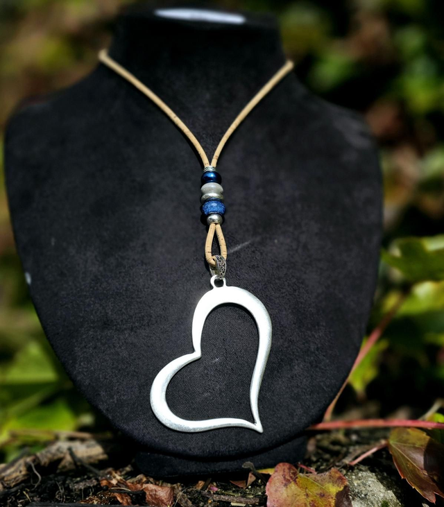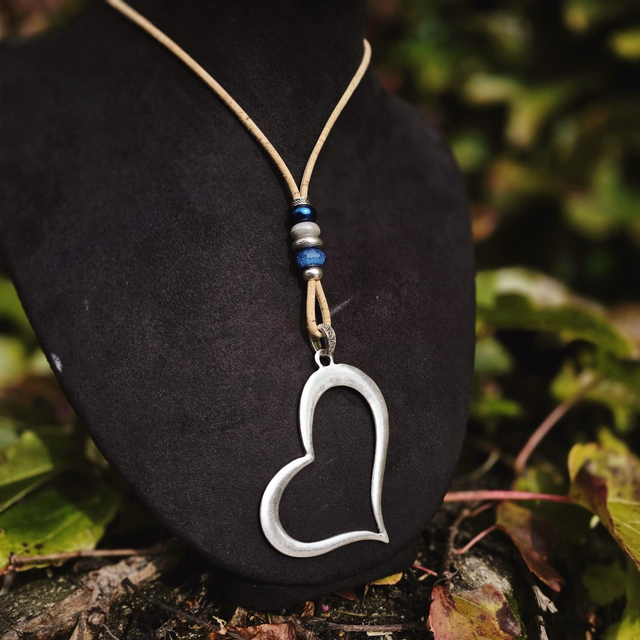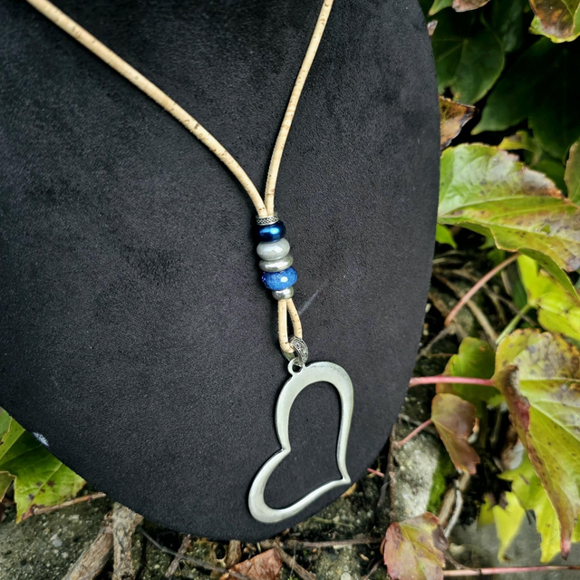 Long sautoir "Sariah" cordon en liège naturel fin, perles en céramique aux tons de bleu/gris et gros pendentif "coeur" creux
