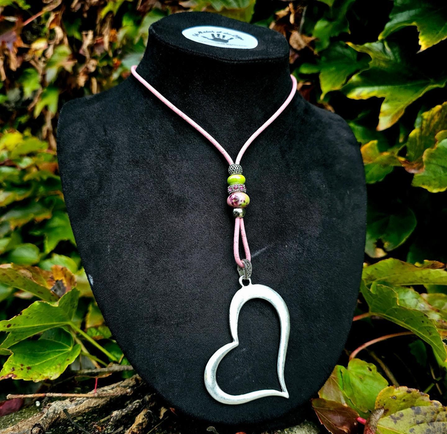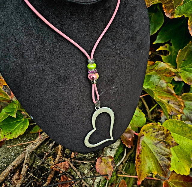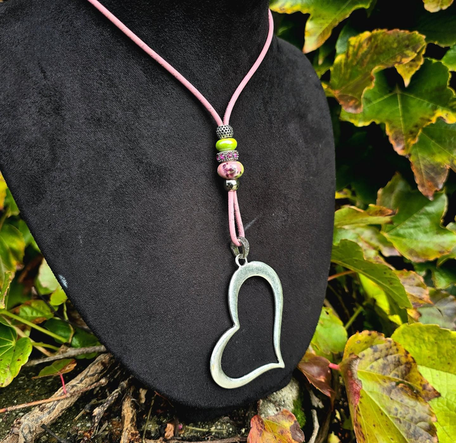 Long sautoir "Sariah" cordon en liège teinté rose bébé fin, perles en céramique aux tons de vert/rose et gros pendentif "coeur" creux