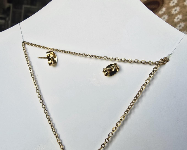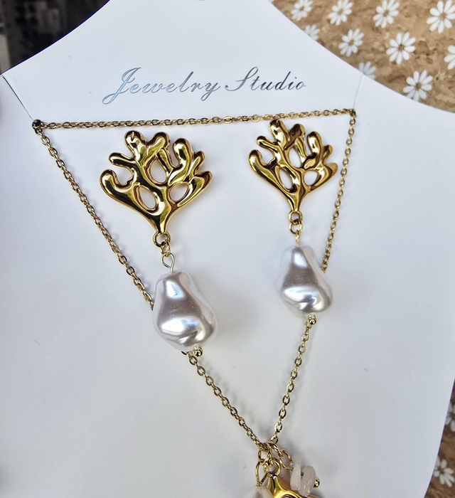 Long sautoir "Sariah" cordon en liège naturel fin, perles en céramique aux tons de bleu/gris et gros pendentif "coeur" creux