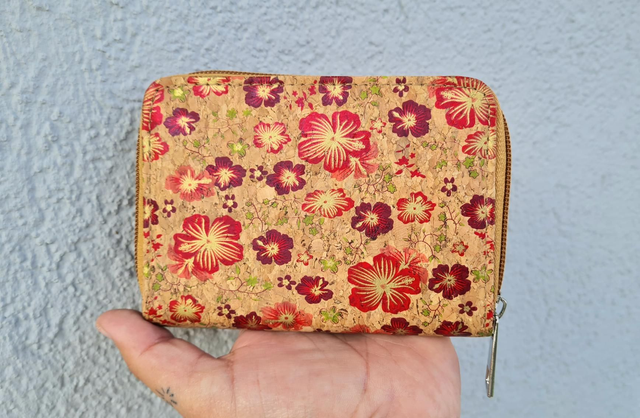 Petit porte-monnaie en liège imprimé fleurs brillantes avec fermeture zip