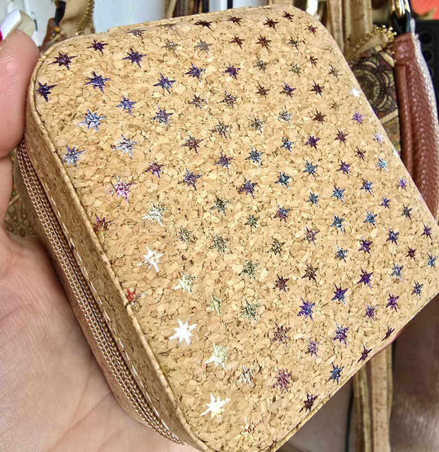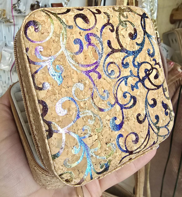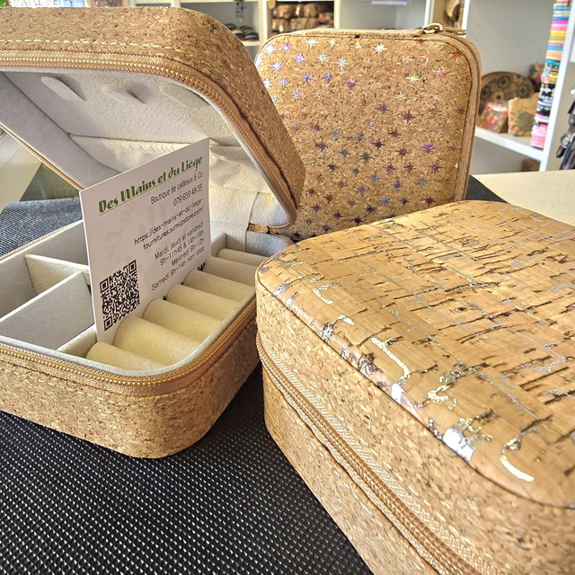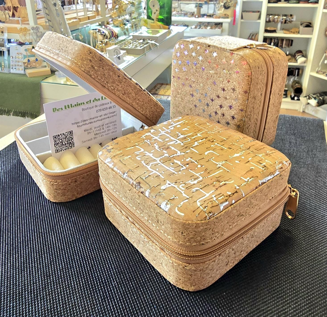 Petites boîtes à bijoux de voyage fourré de tissu en liège naturel et imprimés métallisés (3 modèles à choix)