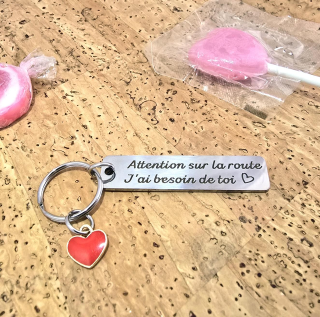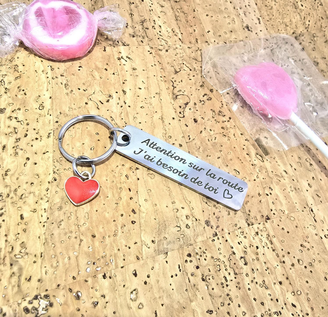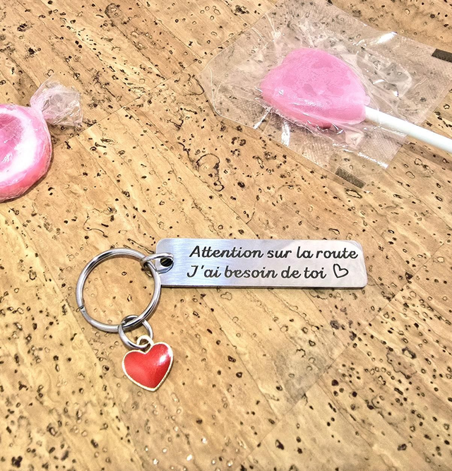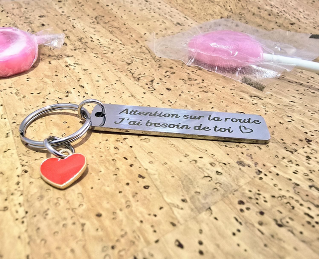 Porte-clès plaque rectangulaire "Attention" en acier + coeur