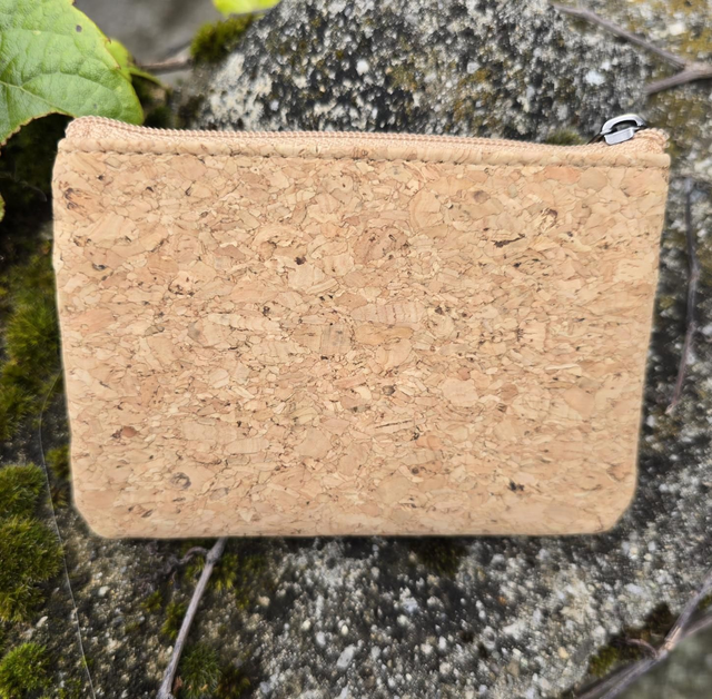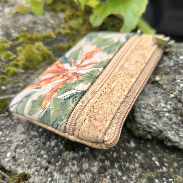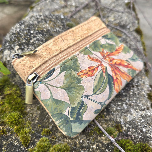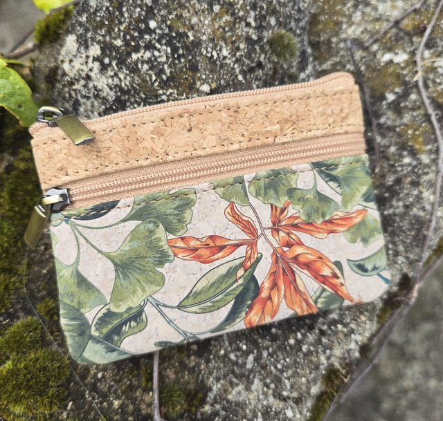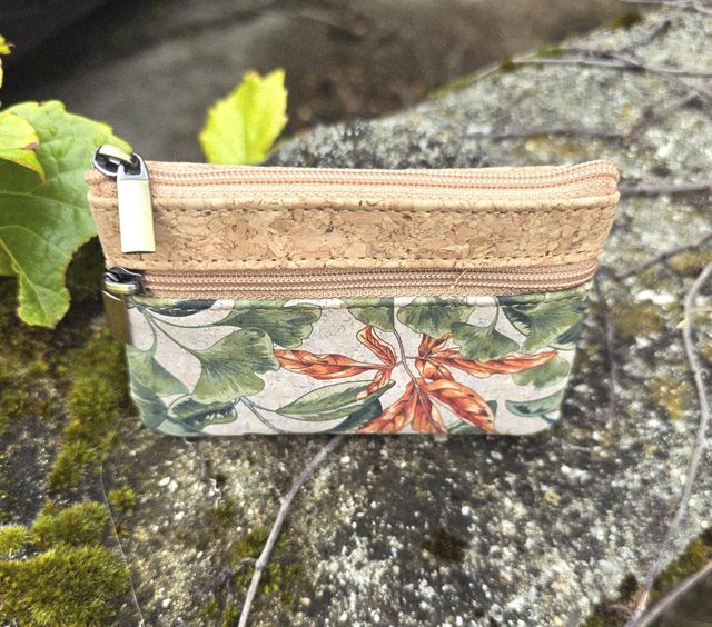 Porte-monnaie "Malo" en tissu de liège naturel et imprimé ginkgo avec 2 poches zip