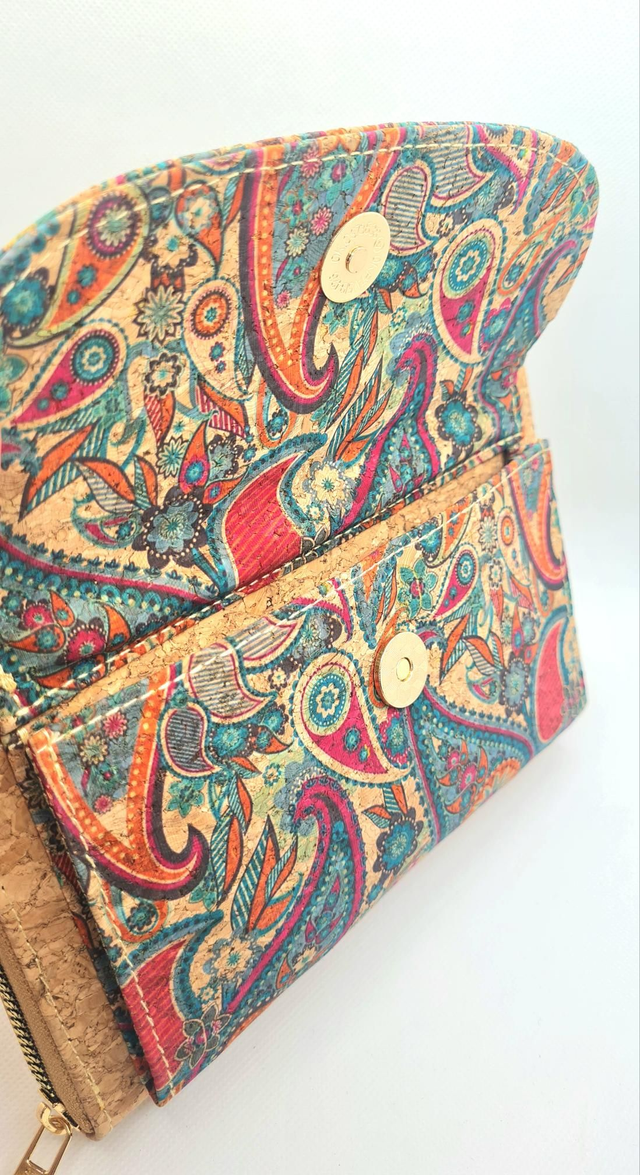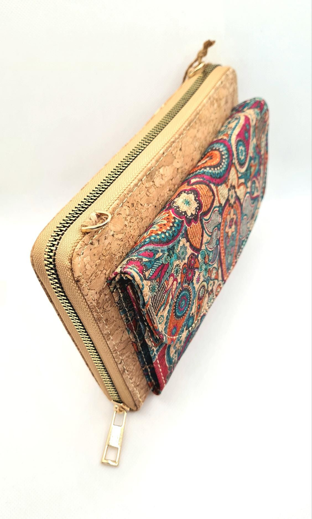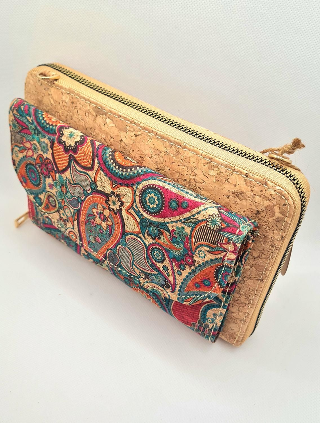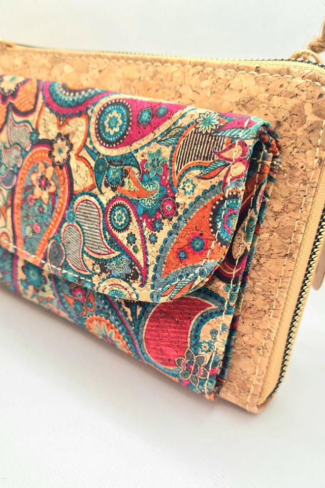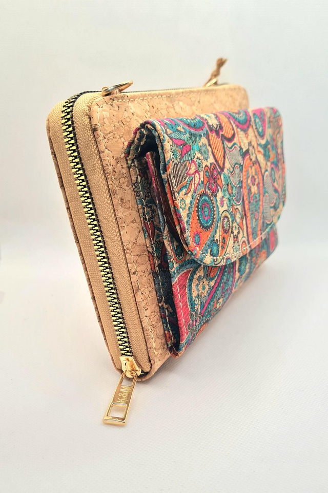 Porte-monnaie/pochette "Miriam" pour natel 2en1 en liège naturel et imprimé tons orangés/turquoise (bandoulière amovible)