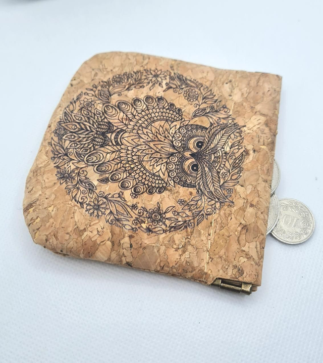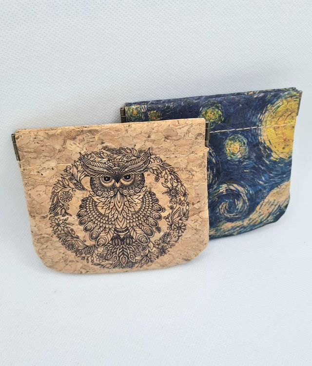 Porte-pièces en tissu de liège naturel imprimé hibou taille M