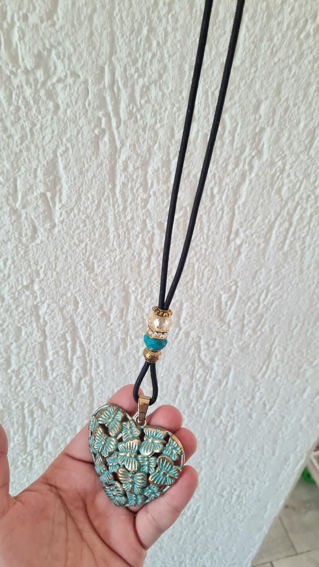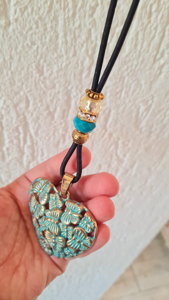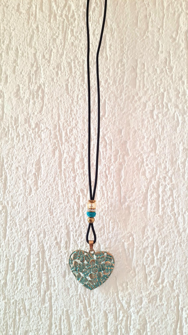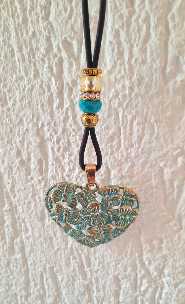 Sautoir en liège teintée noir + pendentif Coeur or/papillons